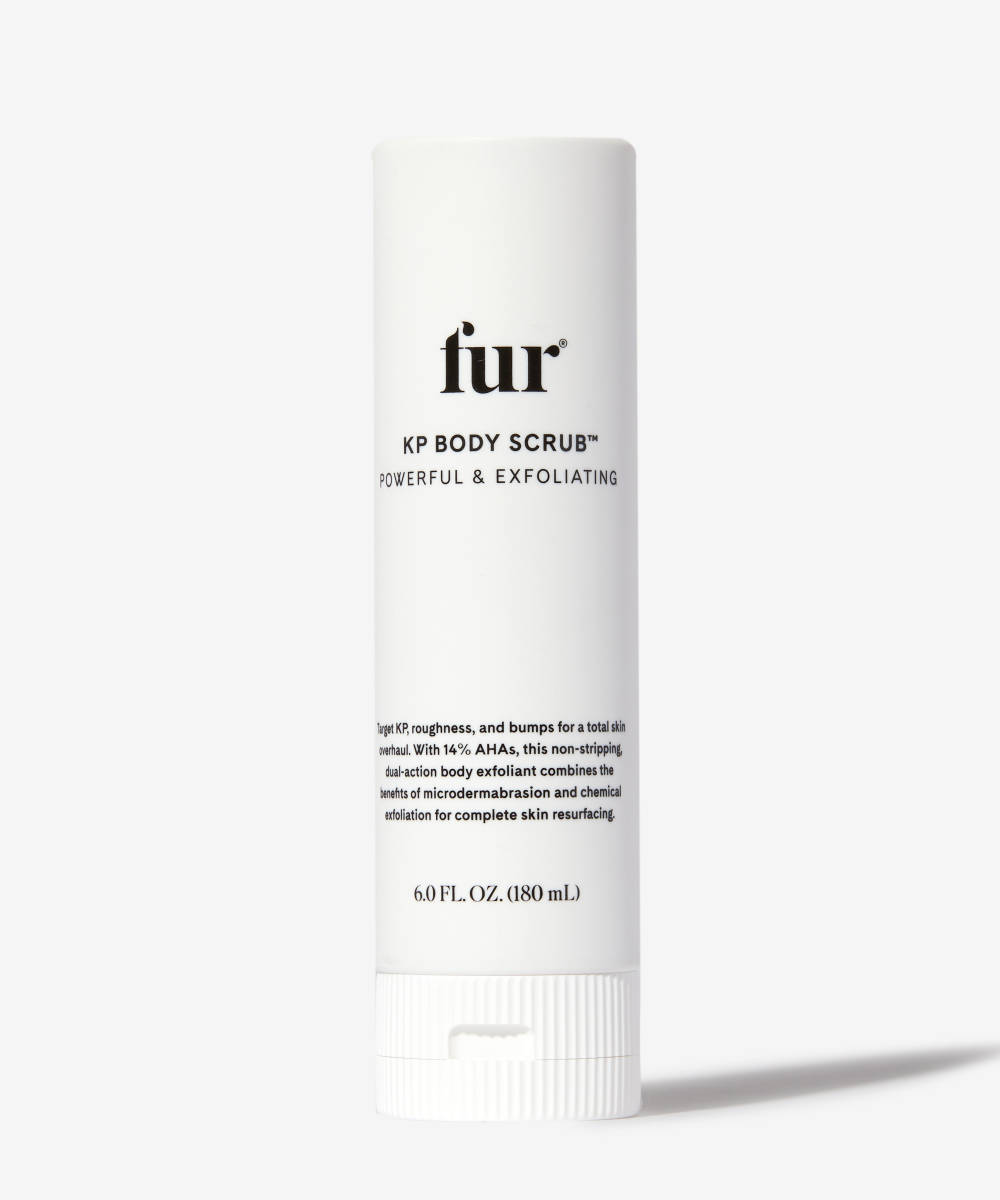 Keratosis pilaris (KP) — commonly known as ‘chicken skin’ — are bumps and scaly patches that surround hair follicles on the skin. It’s caused by an excess of keratin, which blocks the hair follicle and forms bumps. To help alleviate KP, regular exfoliation with chemical exfoliation can help. Luckily for us, Fur has created the KP Body Scrub specifically for that reason. Supercharged with powerful AHAs to unblock pores and sunflower oil to hydrate, this is your one-way ticket to smooth skin.