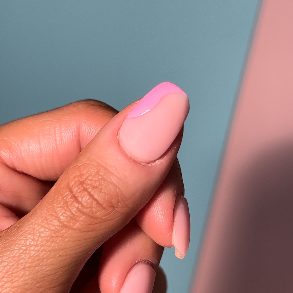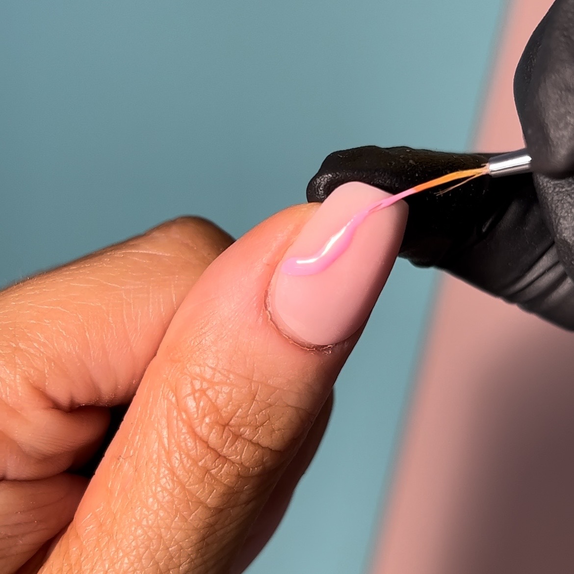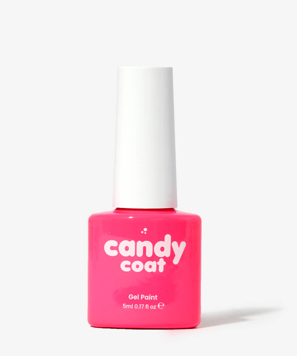 Using a fine liner brush, create a swirly line in the corner of your nail and then fill it in. We’re using a bright pink gel polish, but feel free to switch it up for the colour of your choice, just make sure it’s bright. When you’re happy with your shape, cure it for 60 seconds in your lamp.