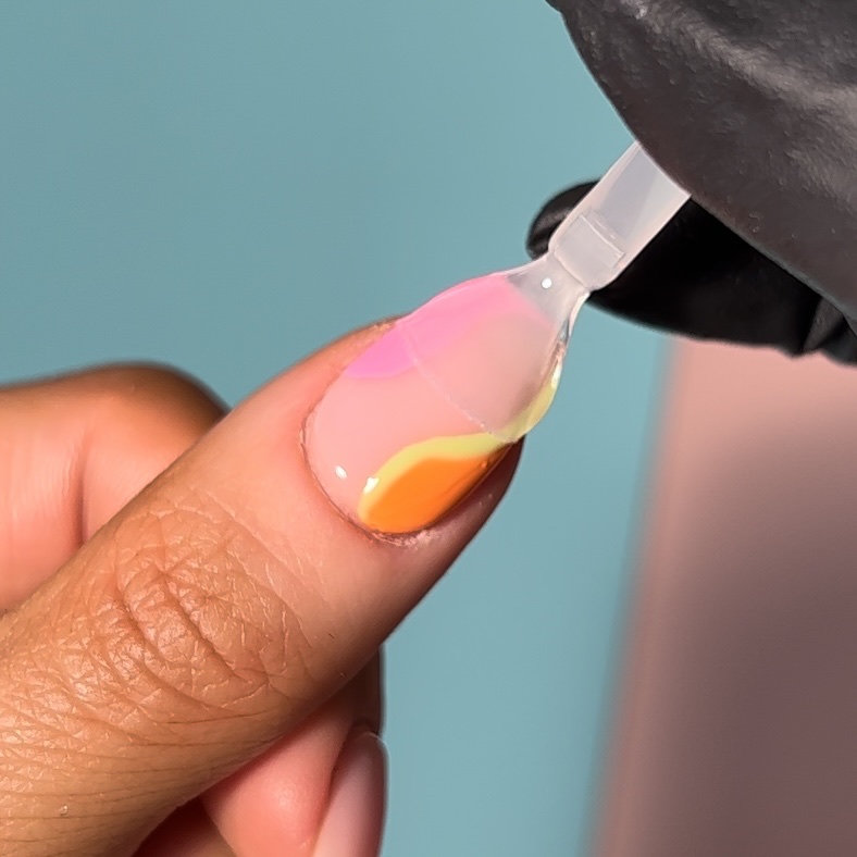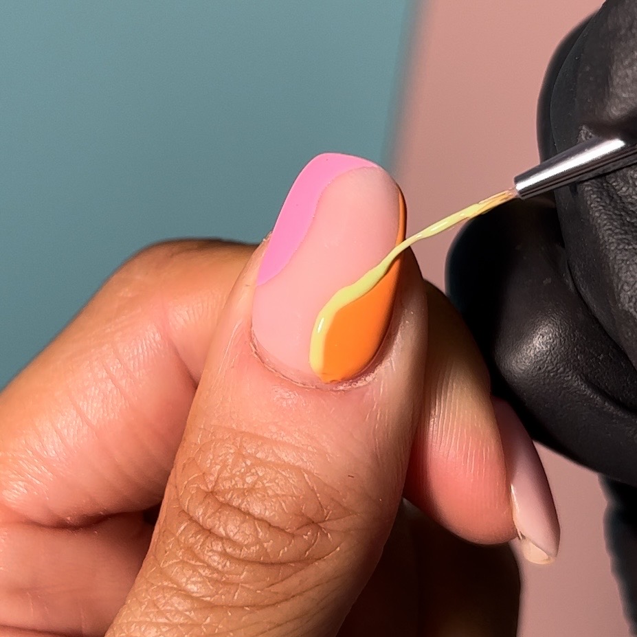 Once your pink and orange polishes are cured, take your fine liner brush and yellow gel polish and carefully outline your orange shape. Do not fill in this section, and then cure for 60 seconds.
