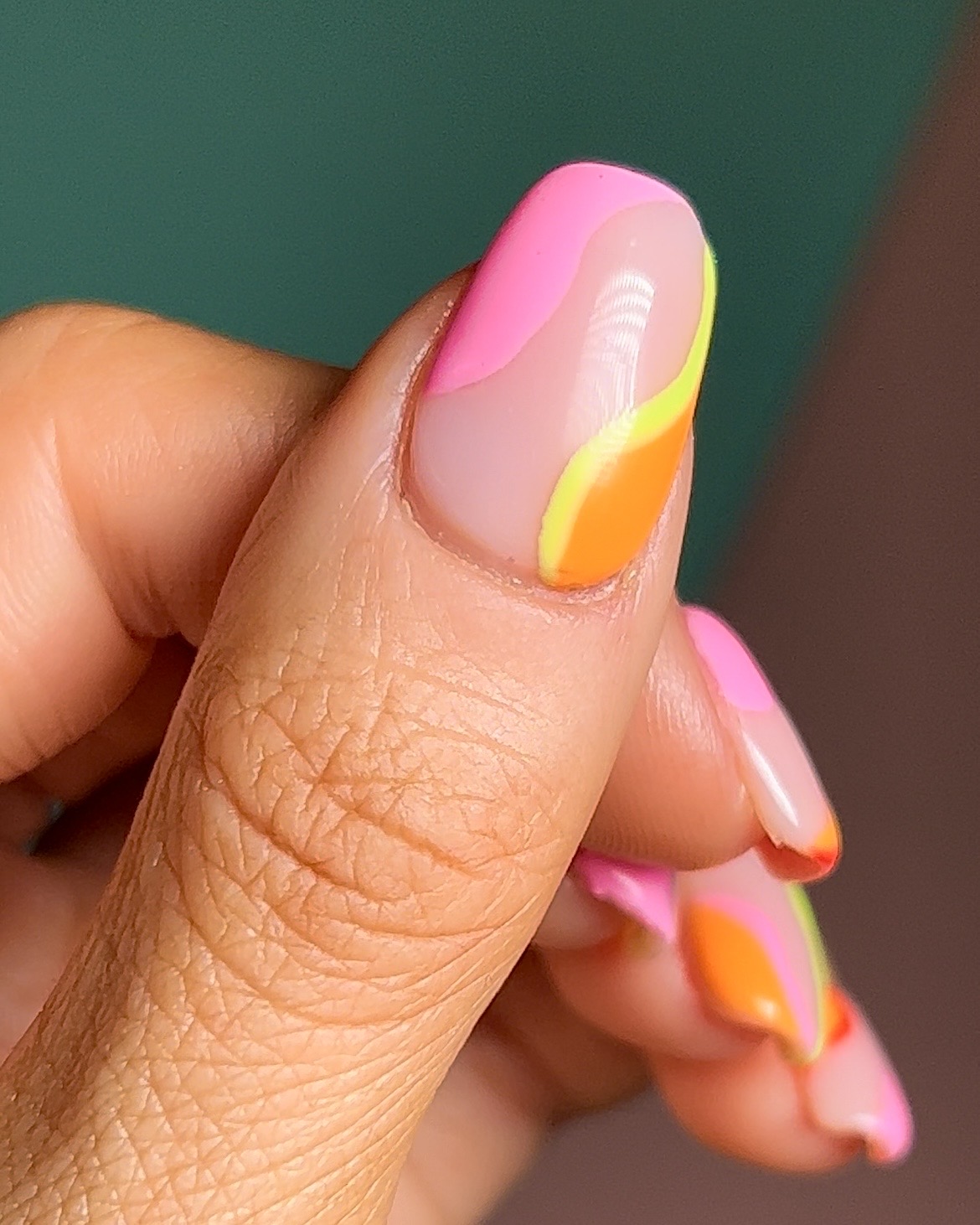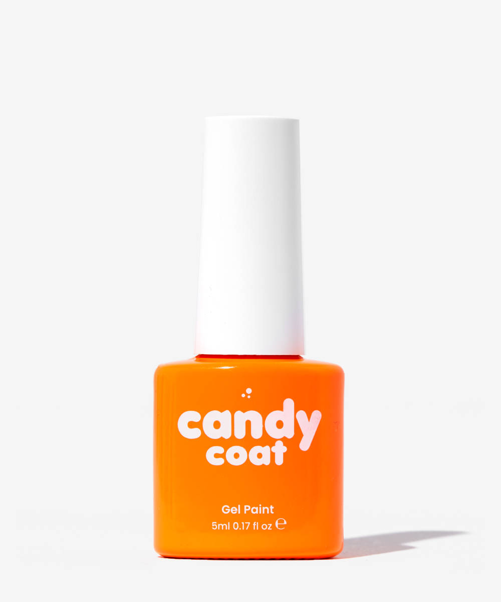 On the other side of your nail, repeat step two but with a bright orange polish. Create your abstract outline and fill it in using your fine liner brush, create a swirly line in the corner of your nail and then fill it in. Cure for 60 seconds.