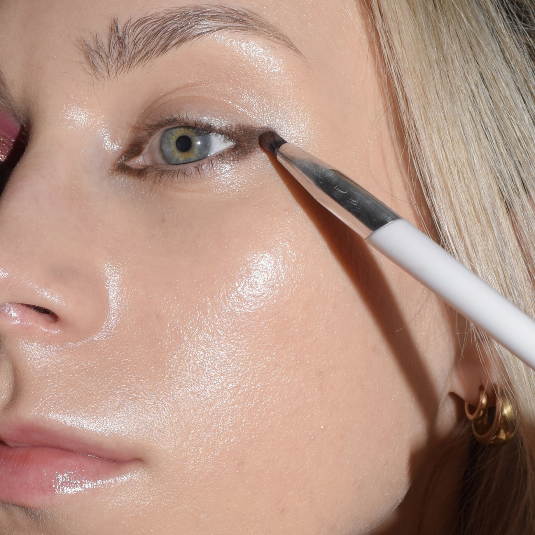 Take shade Angel of the North from the Jade x BEAUTY BAY 42 Colour Palette on the By BEAUTY BAY Pointed Liner Brush BB210 and create a winged effect on the inner and outer corner of the eyes.