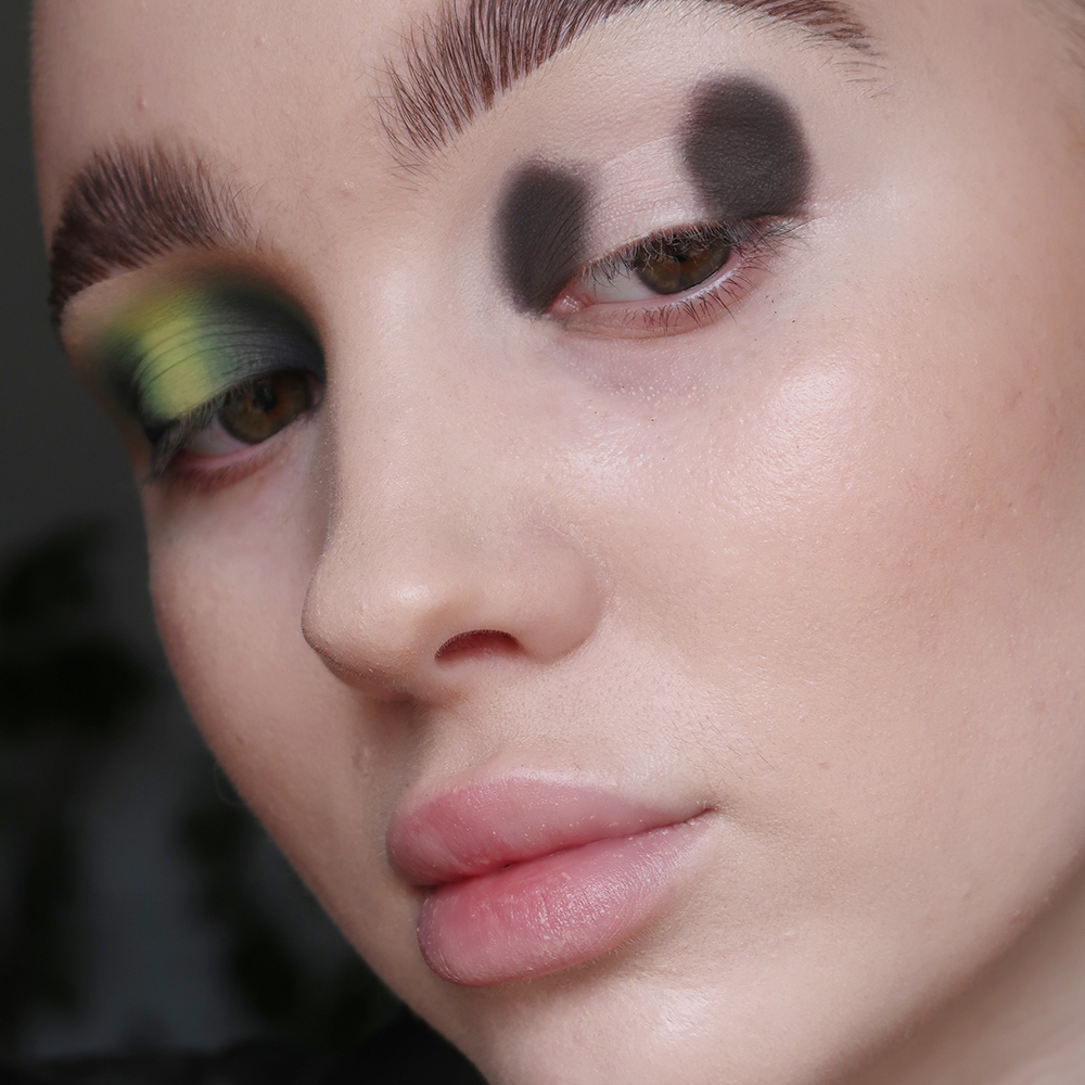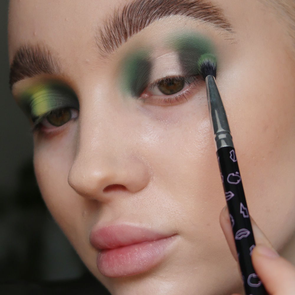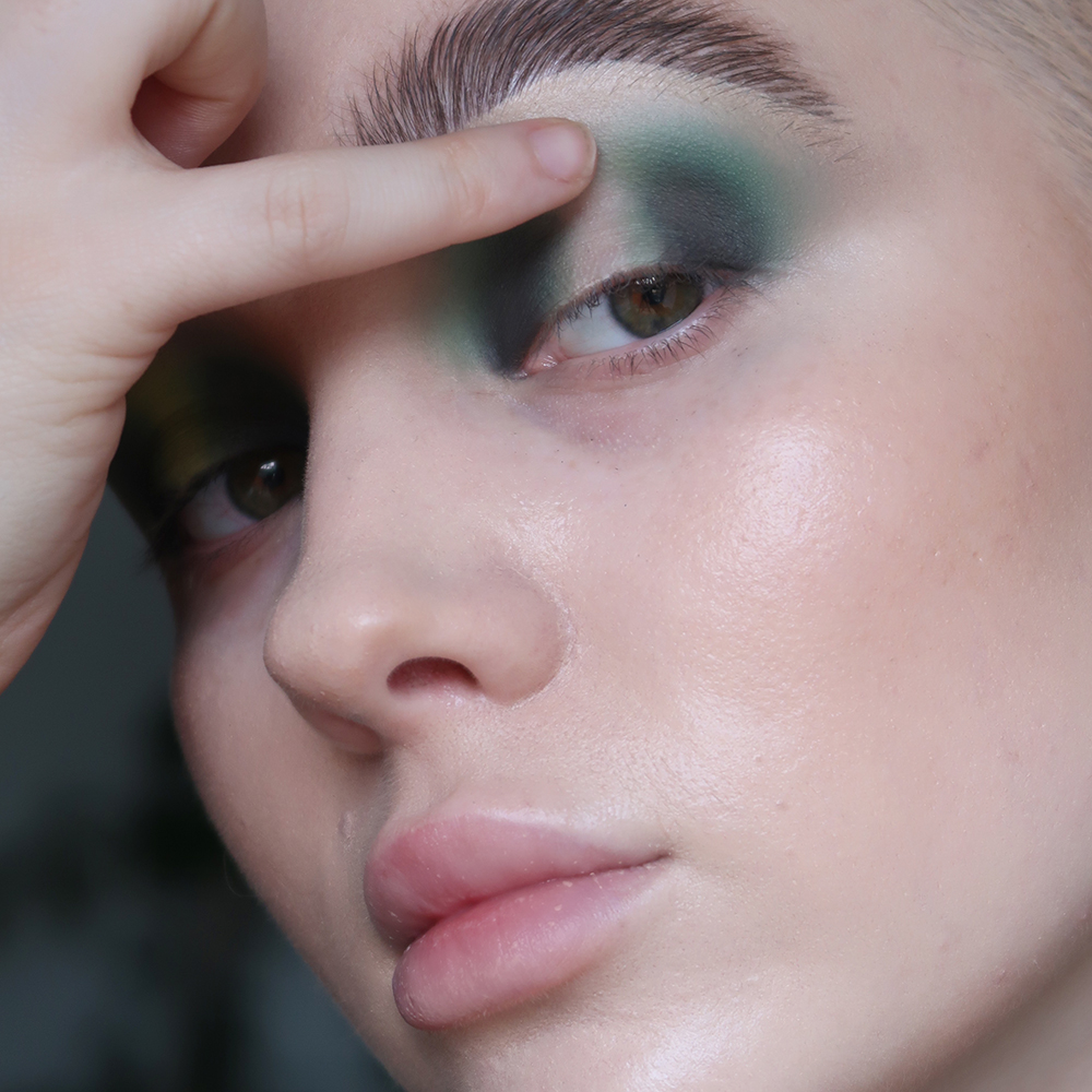 Next, take Jungle LEAVES and begin to blend the first shade up and out, aiming to create a seamless transition from shade Bagheera FUR in the crease, to the natural skin tone up by the brow bone.