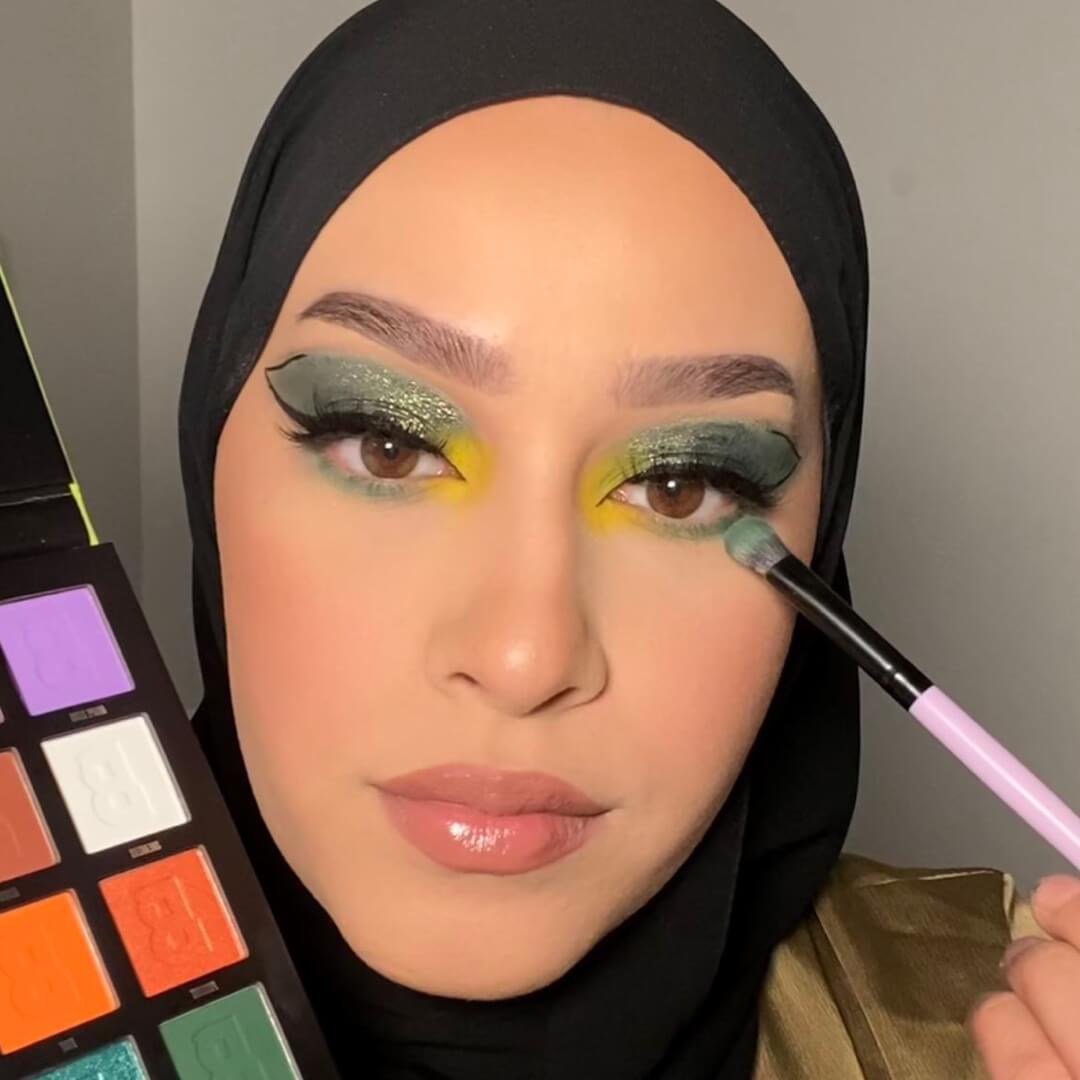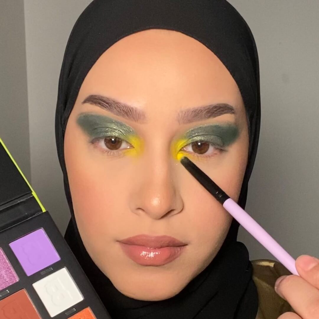 Using a flat eyeshadow brush, apply a small amount of the shade Kale from the By BEAUTY BAY Bright 2.0 16 Colour Palette to the outer end of your lower lash line, then blend inwards to meet the yellow pigment of your inner corner highlight.