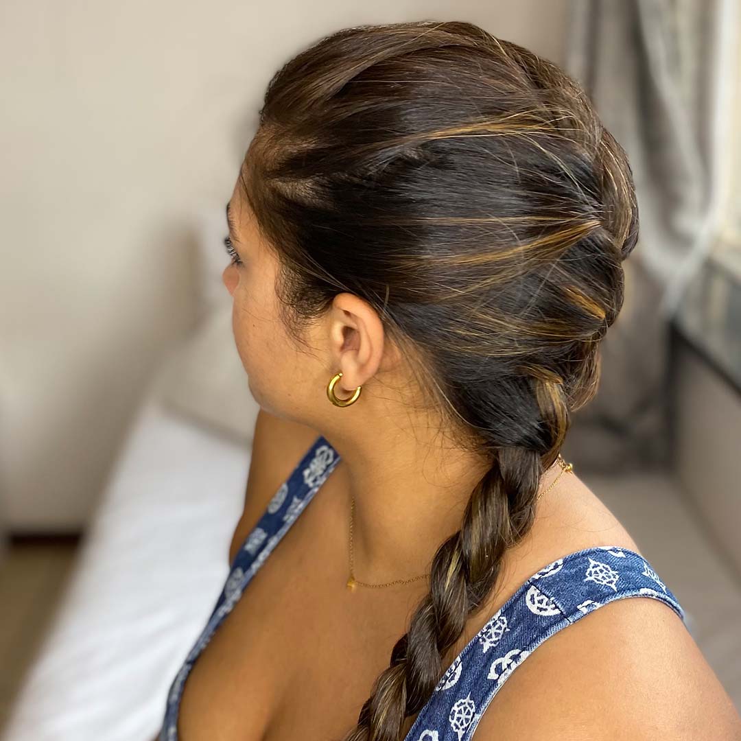 Repeat the steps until the braid is complete and secure with a hair tie.