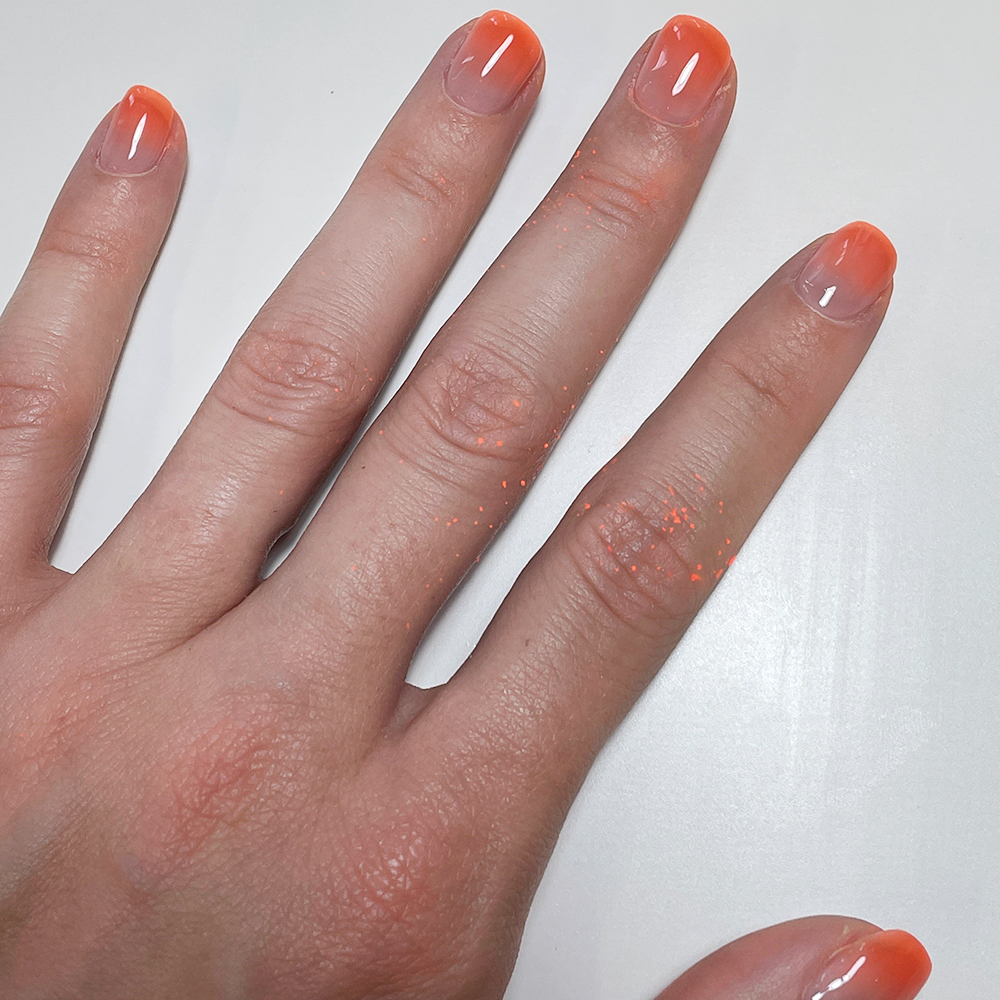 Once you’ve manicured your nails and cuticles, apply a clear base coat and allow it to dry (or cure if you’re using gel). Then apply the base polish colour. Let it dry/cure and repeat until you’re satisfied with the finish. If you’re not using a polish colour that matches your natural nails, choose a shade that will blend well with the colour of the pigment you’ve chosen. This will make it much easier to achieve the ombré effect.