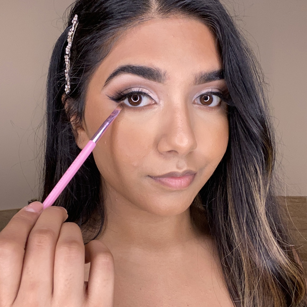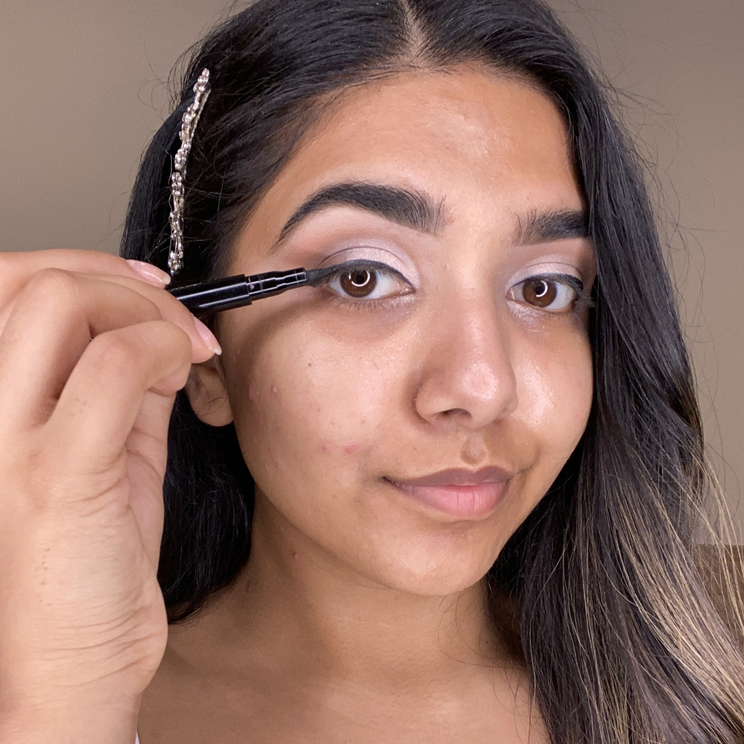 Using our Felt Tip Liquid Eyeliner, create a winged line starting at the inner corner of the eye and working out to the edge until you form a flick. To make your wing super sharp, clean up your flick with a concealer brush.