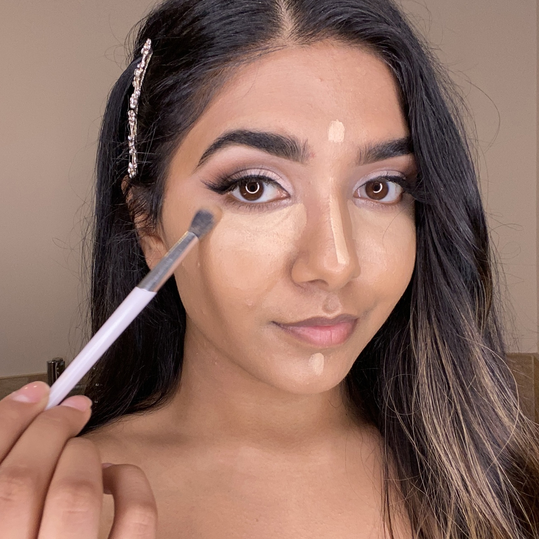 To create a flawless, fresh-faced base, apply foundation to the skin using a brush or sponge. Follow with concealer, applying to the areas of your face that you want to highlight, including under the eyes, the bridge of the nose, the forehead, and the chin.
