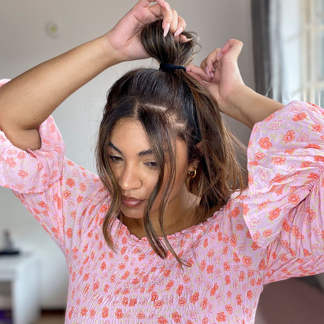 Once you are on the final loop of the hair tie, do not pull the ponytail fully through the loop.