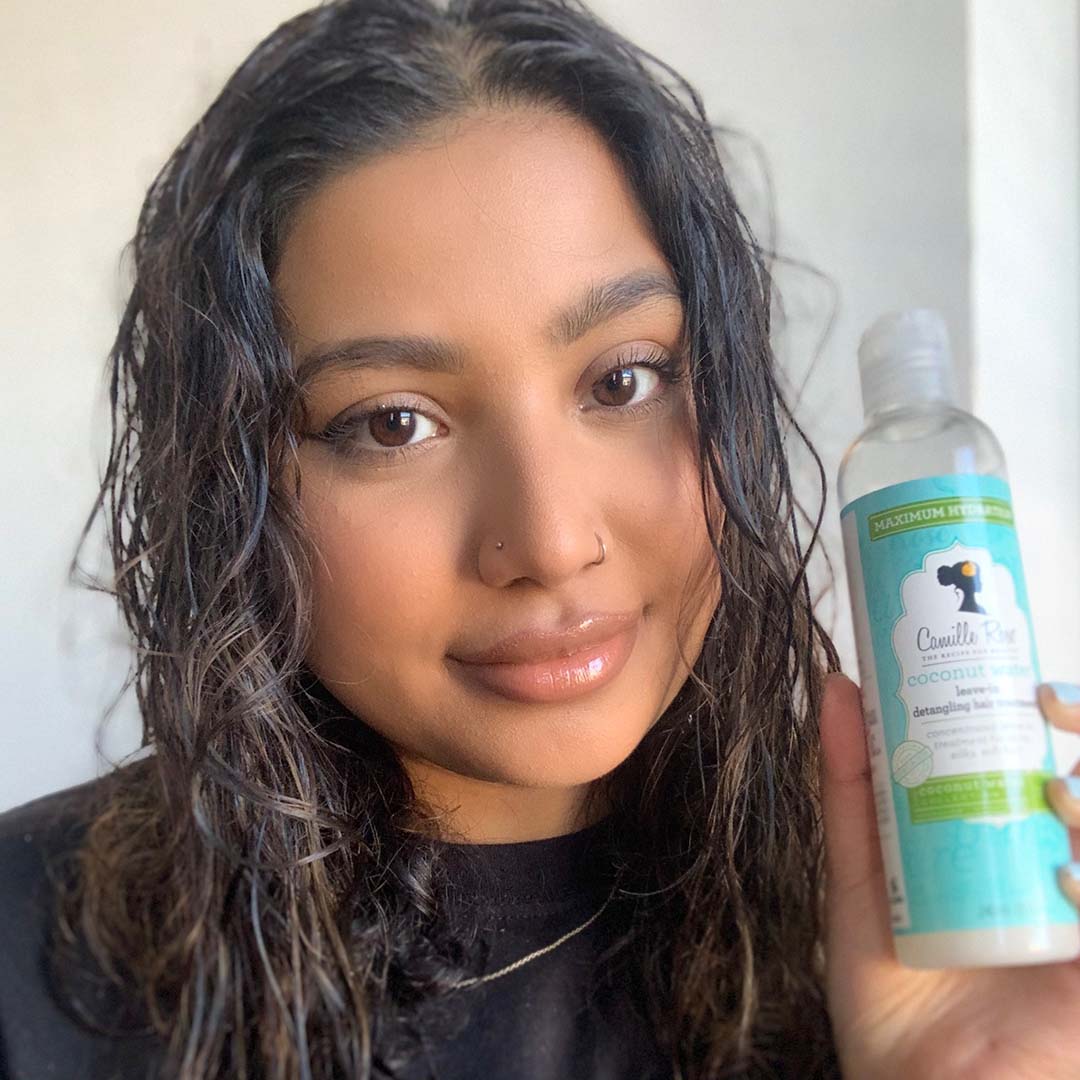 Take a small amount of Camille Rose’s Coconut Water Leave-In Detangling Treatment and rub though wet hair in sections to detangle.