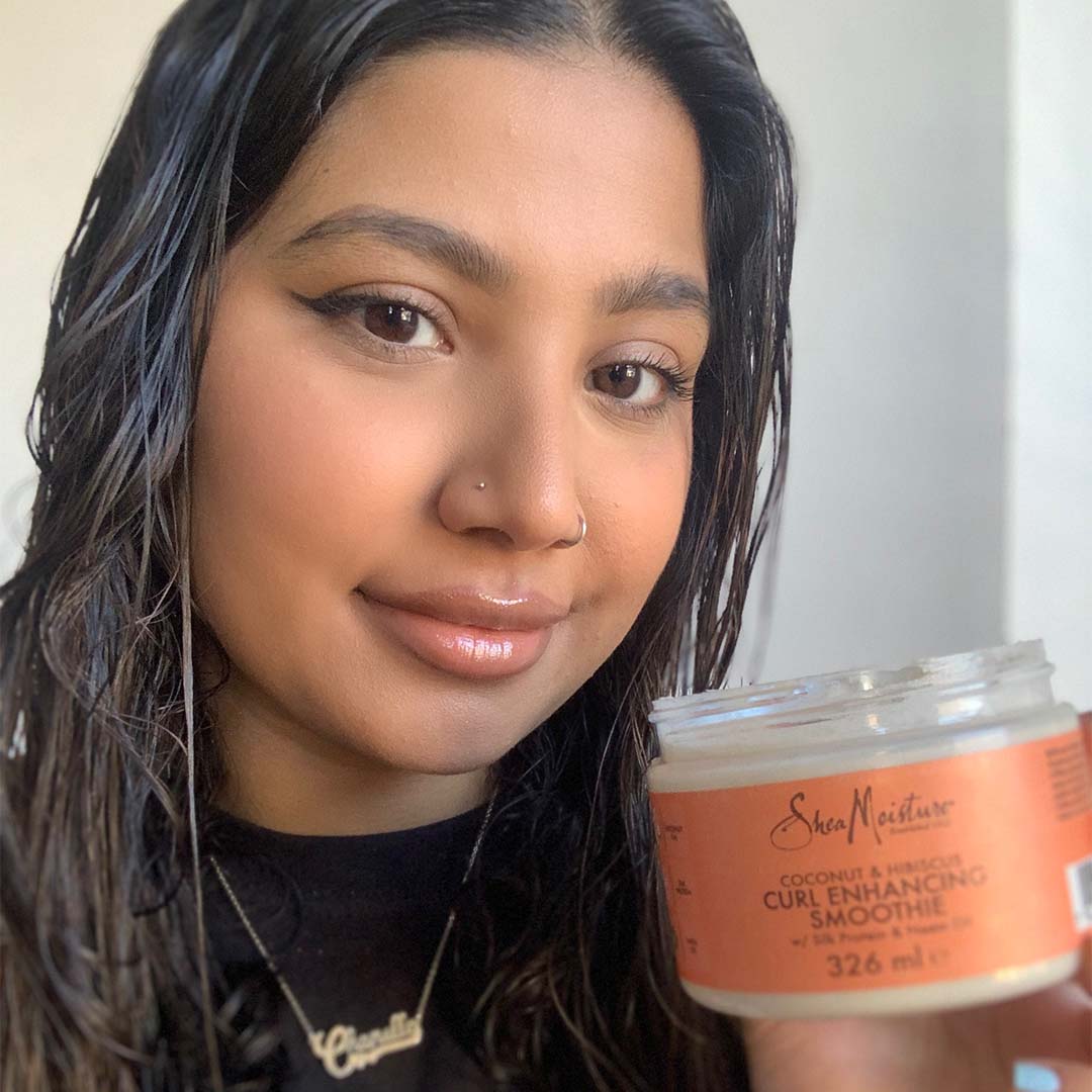 Use a fair amount of Shea Moisture Coconut & Hibiscus Curl Enhancing Smoothie and apply using praying hands to distribute the product through the hair.