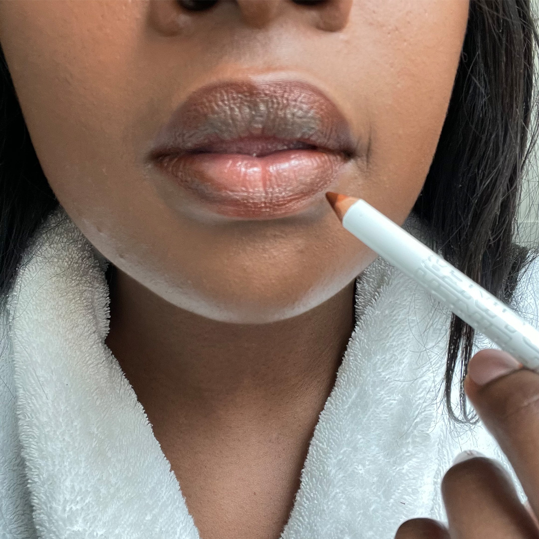 Using a neutral liner draw along the lip line and lightly shade in the corners of the lips.