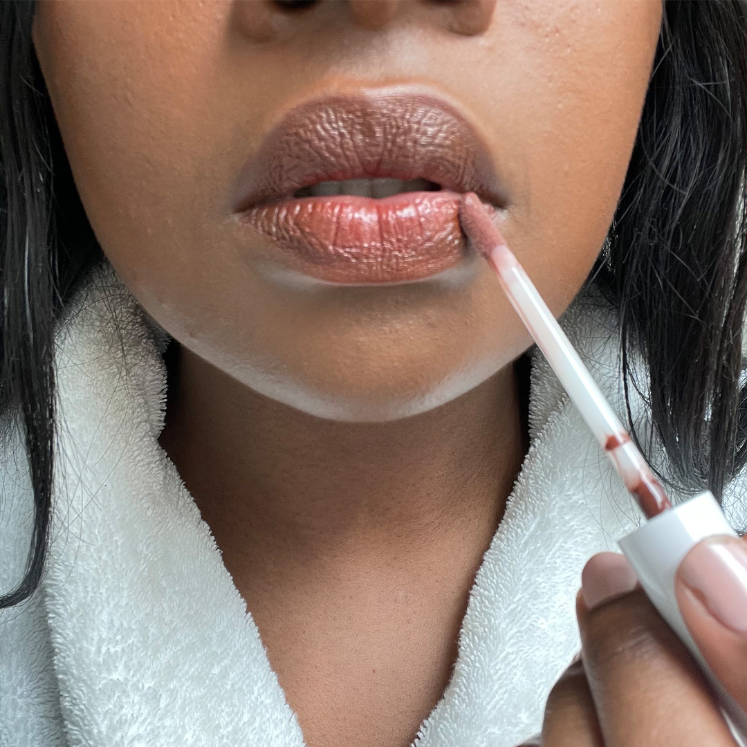 Take a neutral lip gloss and sweep this across the lips.