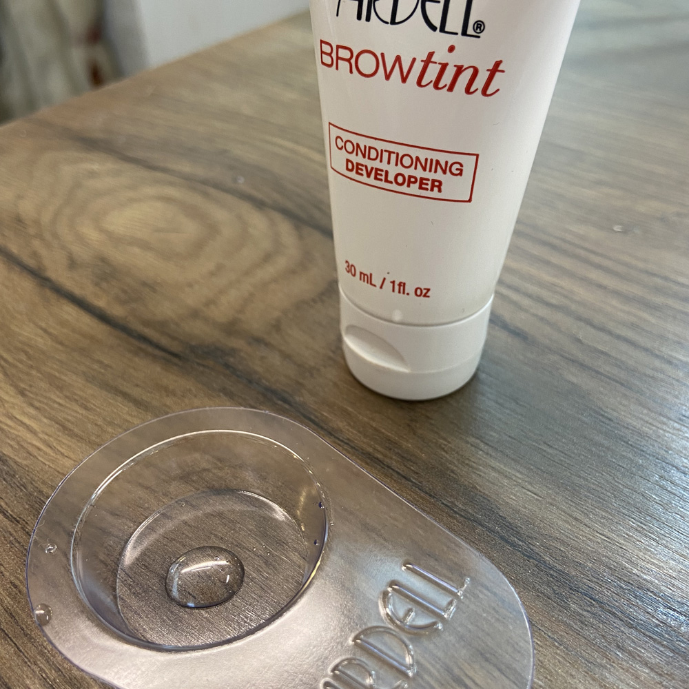 Apply a pea sized amount of developer onto the mixing tray before adding 3/4 shakes of the tinting powder.