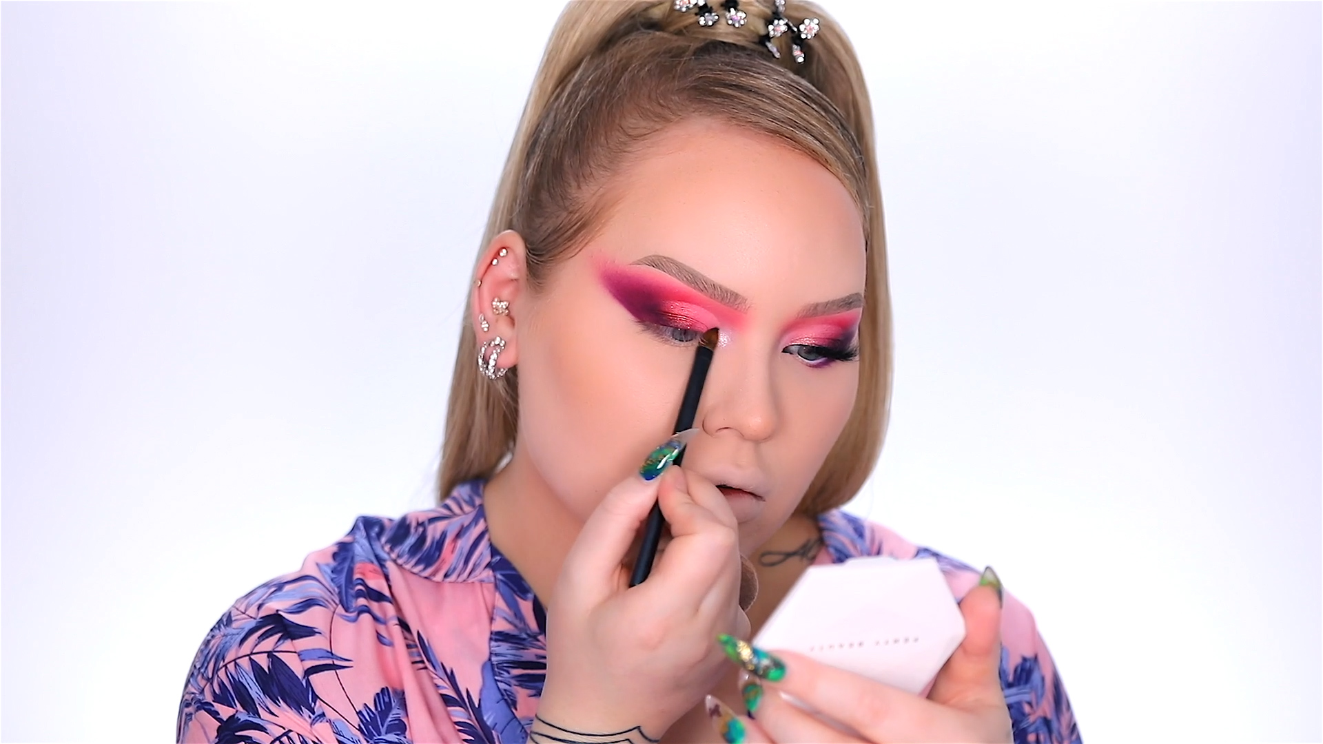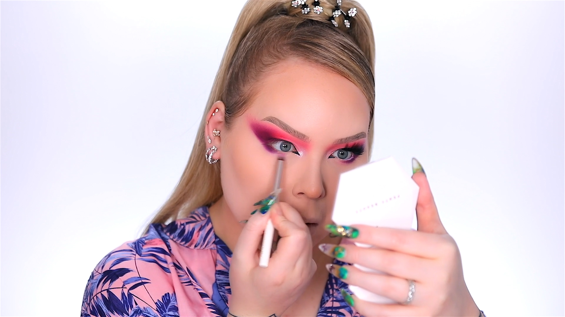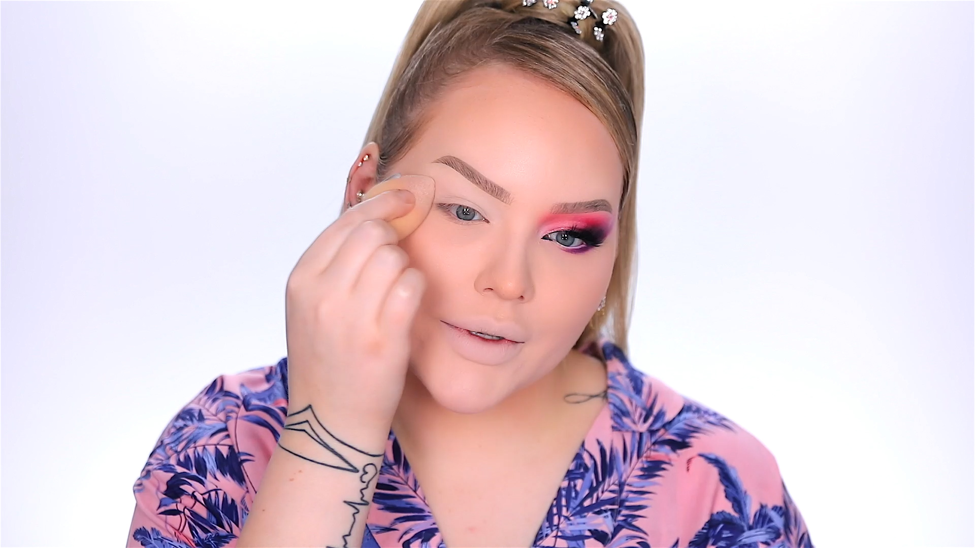 Nikkie applies eyeshadow primer with a brush, then taps in the product with a dry makeup sponge.