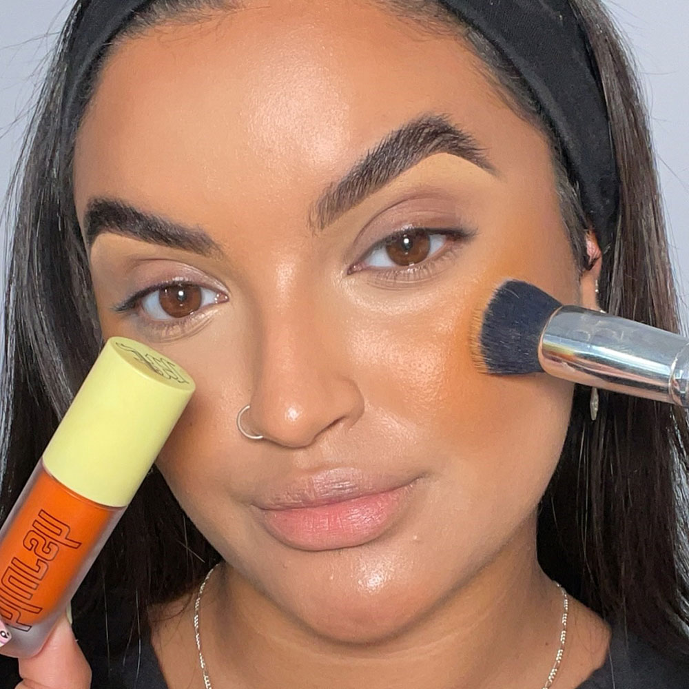 After applying liquid base products, dot and blend Made By Mitchell’s Blursh Liquid Blusher in Mango Daiquiri onto the cheeks.