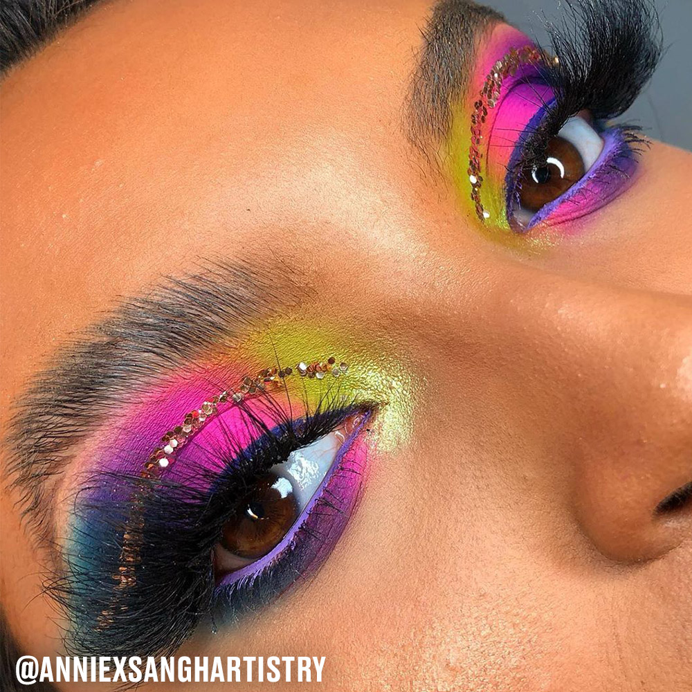 @anniexsangharartistry crafted this iconic multicoloured look using the BPerfect Stacey Marie Carnival XL Pro Palette. Add an extra, extra pair of lashes and you’re halfway there.