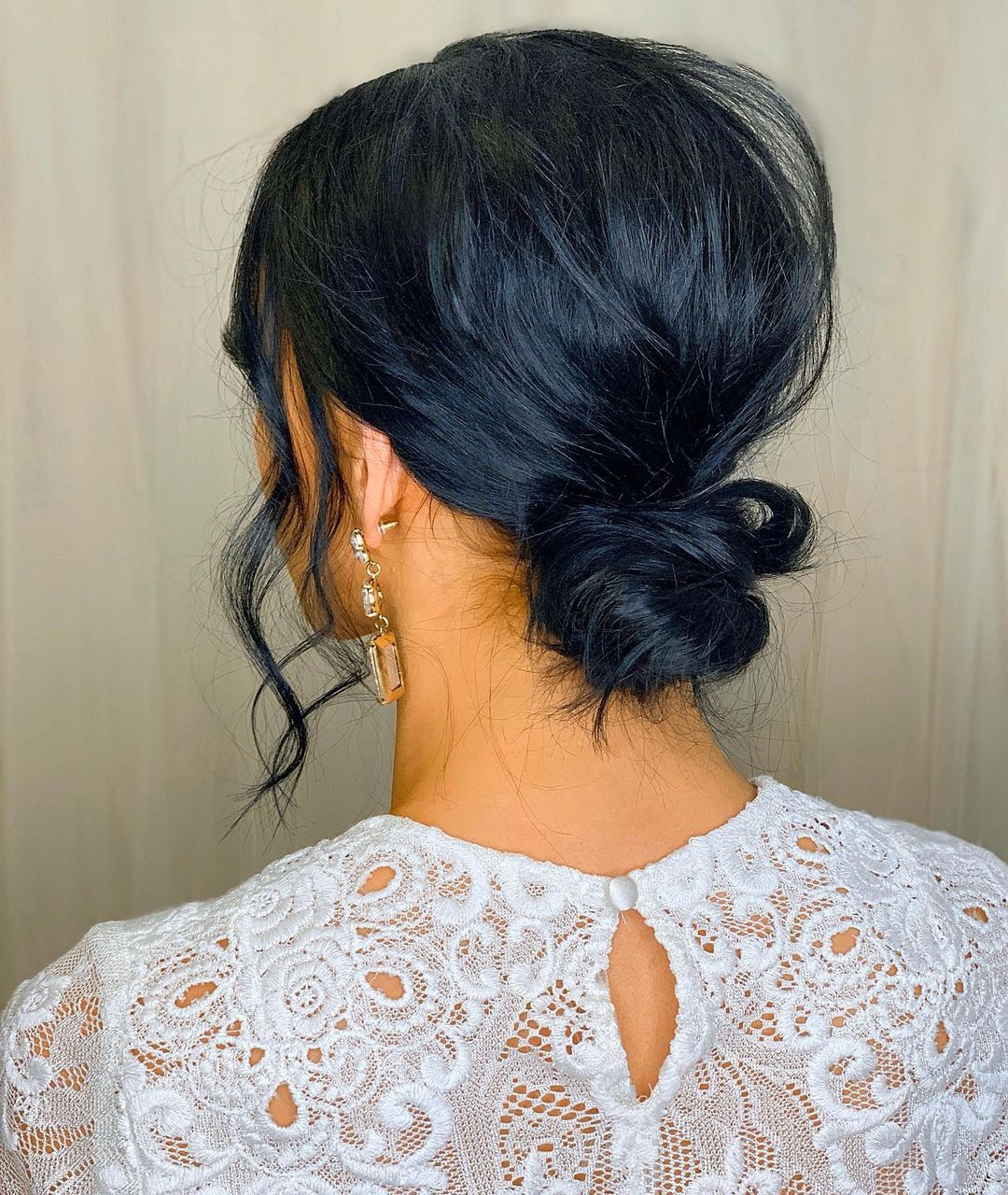 A low bun is a go-to for shorter hair, and @polishedstylejustine has nailed it.