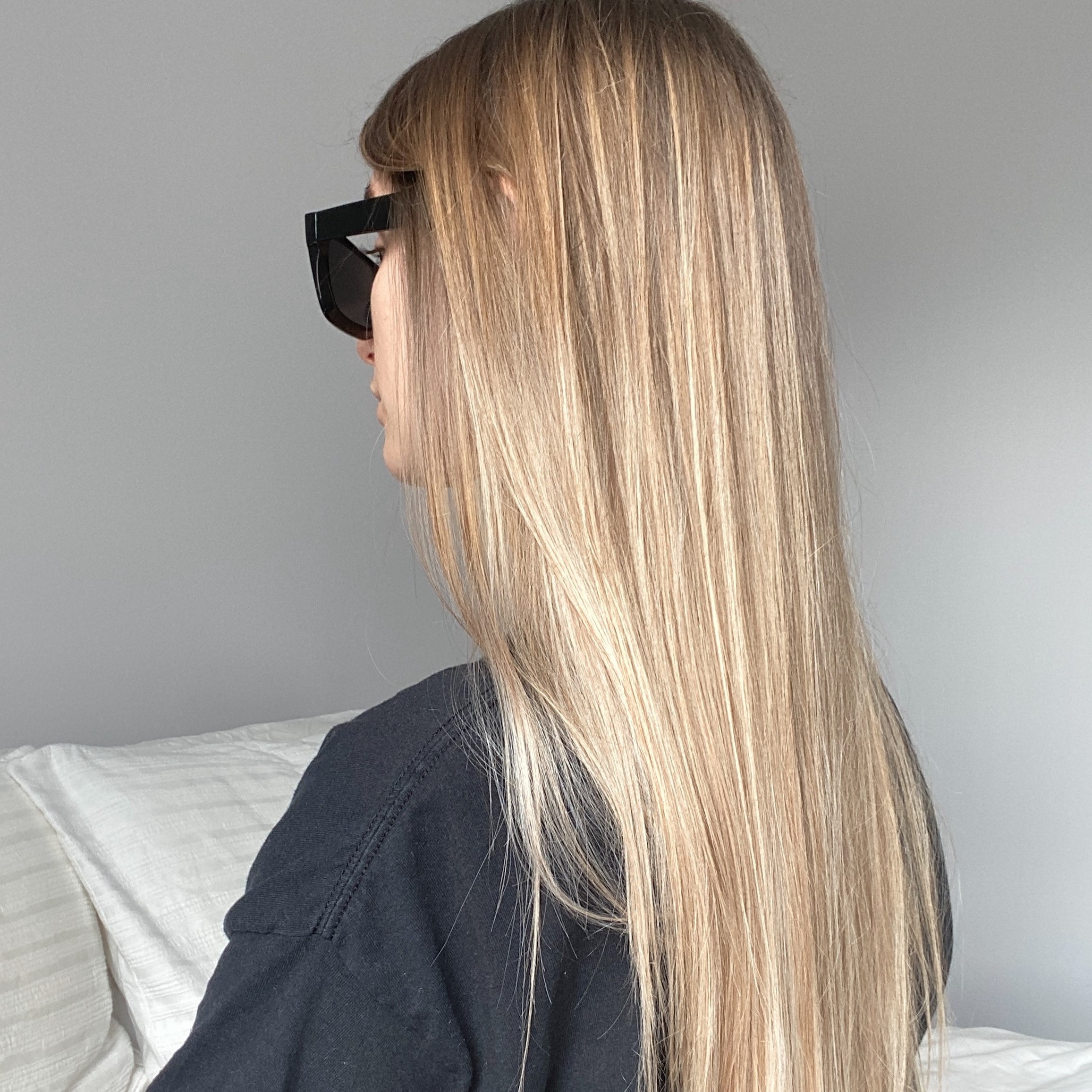 ‘This multi-tasking product is 10/10. A semi-permanent treatment gloss that gives your colour a boost and leaves your hair feeling so soft and looking so shiny. I’ve got balyaged hair and my mid-lengths have the tendency to go a little brassy after a while, the Icy Blonde Hair Gloss neutralises those tones without leaving a blue tint and makes my colour like new.’