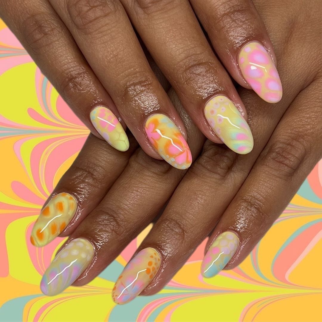 @shelbysnailz is ticking all our boxes with this super cute aura design. The nude base paired with the orange, yellow and green tones is just *chefs kiss*.