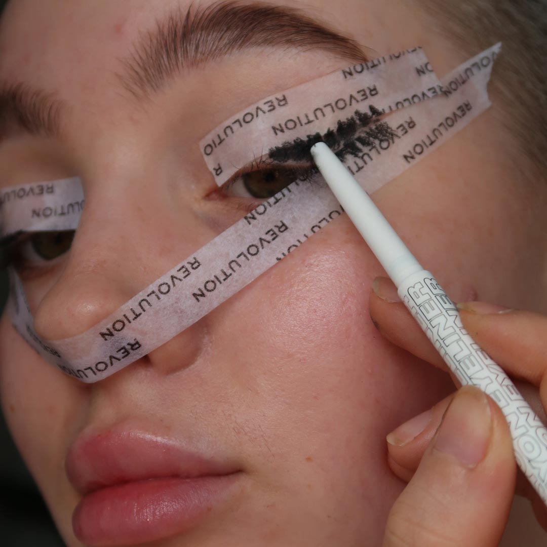 With By BEAUTY BAY’s Crayon Eyeliner in shade Ink, colour in the free space created by the tape.