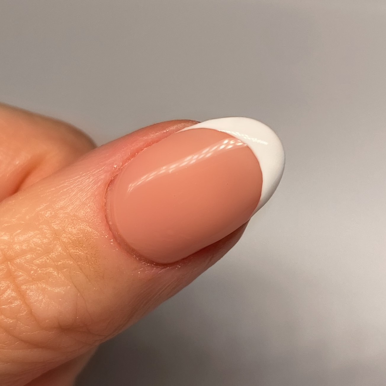 3. Using a white polish and small detailer brush, start by creating a French tip design. Use thin layers and build up the colour until it’s opaque and completely dry.
