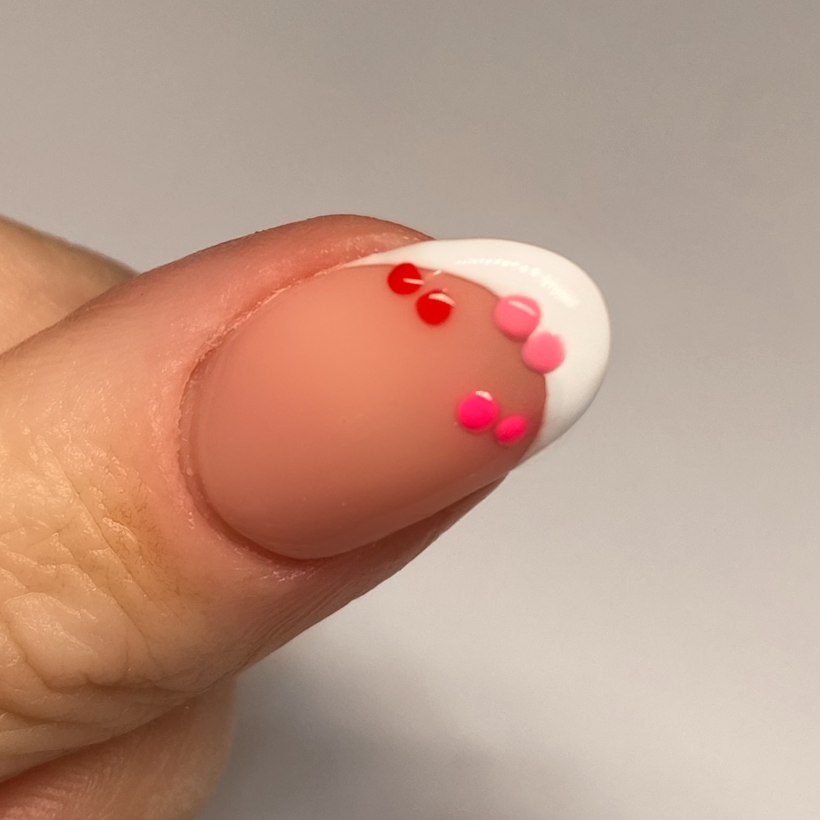 4. Then, using a dotting tool (a bobby pin also works for this step) create three sets of two small dots on the edge of your white polish. Feel free to use which ever colours you’d like, we’ve gone for pink and red. While the polish is still wet, using a small detailer brush, connect the dots to form a heart.