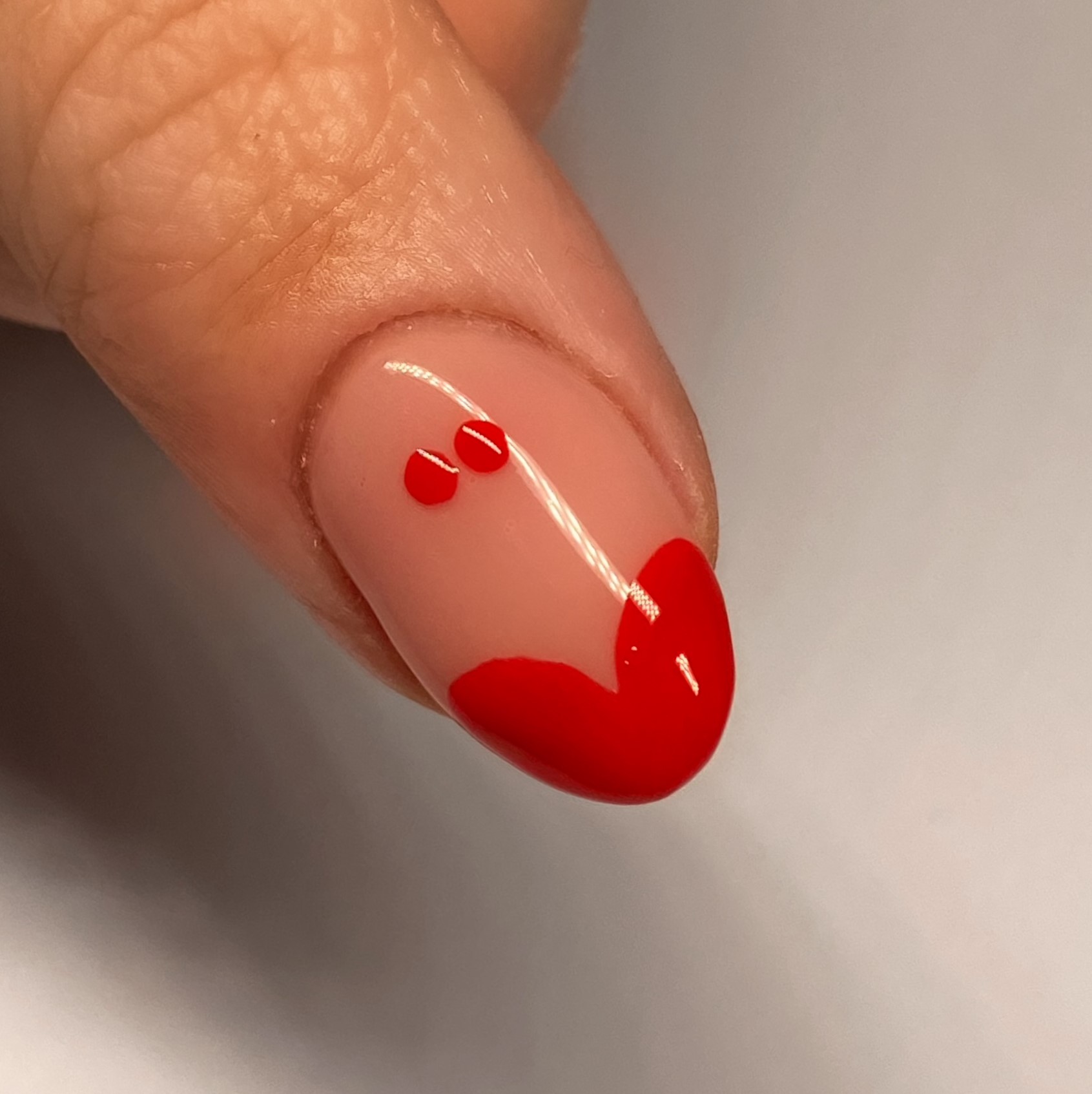 4. Then, using a dotting tool (a bobby pin also works for this step) create two small dots near the cuticle. While the polish is still wet, using a small detailer brush, connect the dots to form a heart.